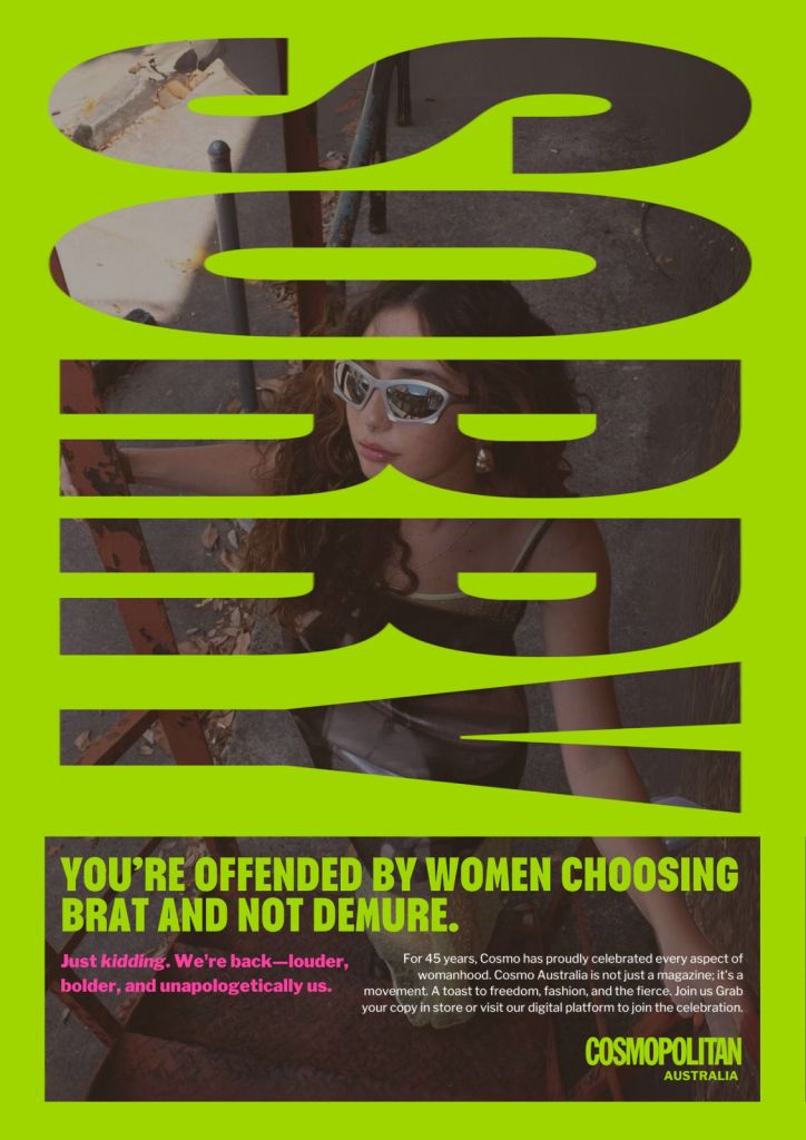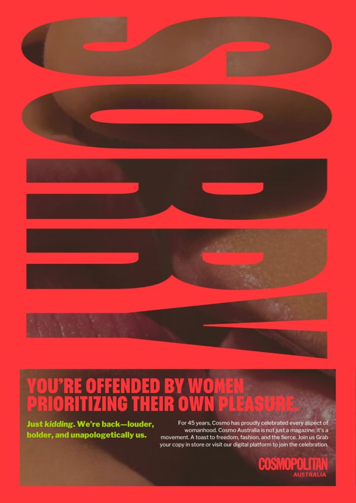 A conceptual advertising and communications strategy and graphic designs for Cosmopolitan Australia’s relaunch in 2024.
